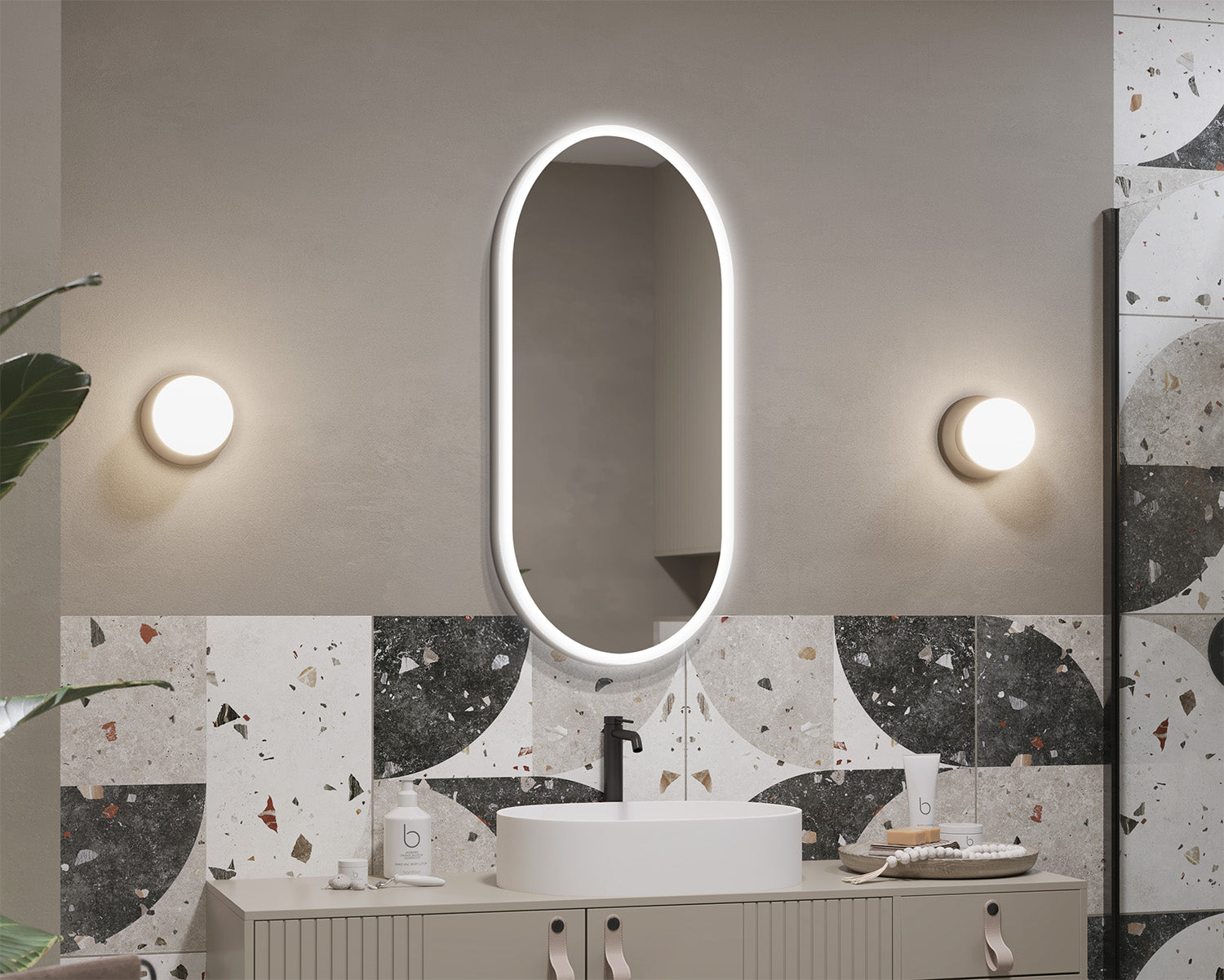 The Auro Alu Crystal S mirror is an oval mirror with LED lighting, featuring a combination of two materials: an outer aluminum frame and an inner acrylic frame. The S version offers a slimmer frame, giving the mirror a light and modern character. This model works well in a variety of bathroom settings, and the robust materials ensure durability and comfort for everyday use.