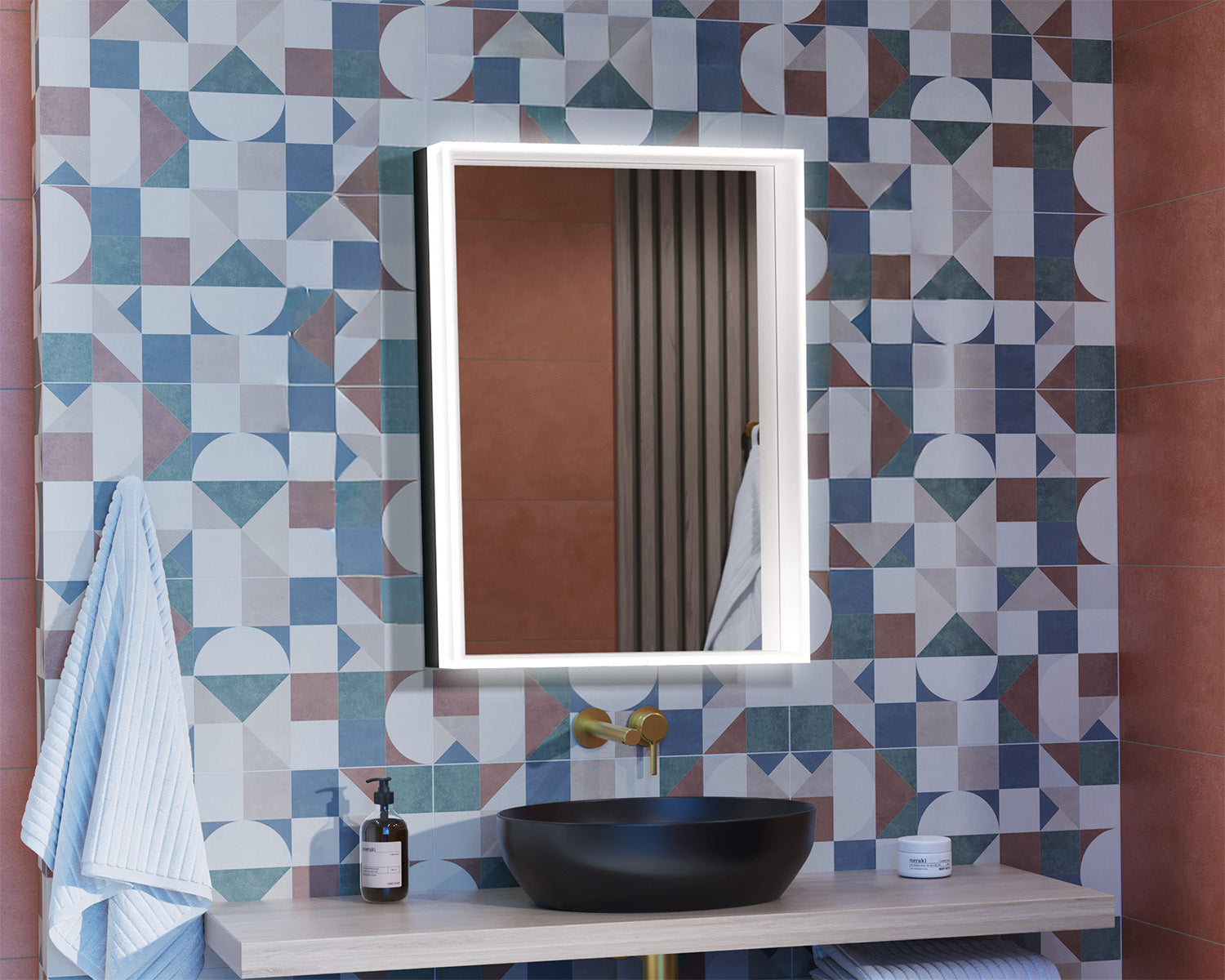 The Nices Alu Crystal M mirror is a rectangular mirror with LED lighting, constructed from a combination of an aluminum outer frame and an acrylic inner frame. The M version has a wider profile, giving the entire piece a distinct, solid form. Careful construction and material selection translate into durability and aesthetic appeal, making the mirror a perfect addition to both modern and classic bathroom designs.