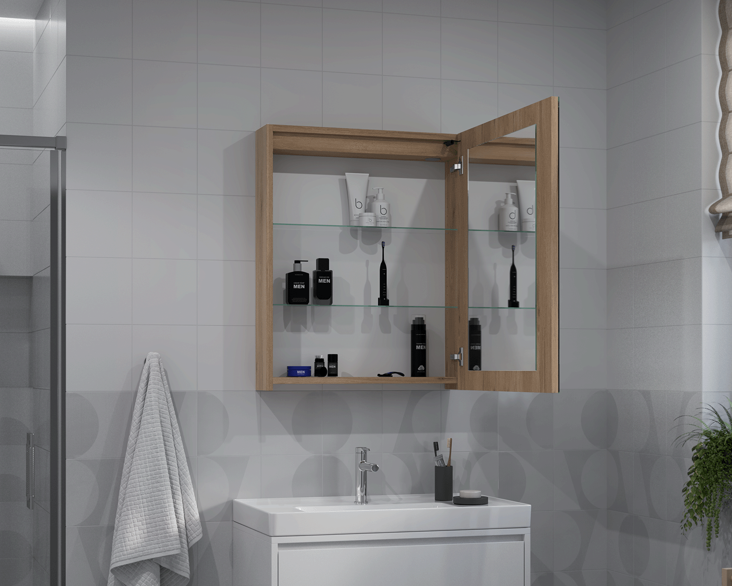 The Aurica cabinet is a functional bathroom cabinet with a mirrored front. Inside, it features practical shelving for convenient storage of everyday toiletries and accessories. Its simple, modern design makes it a perfect fit for a variety of bathroom designs. Crafted from durable materials, it ensures comfort and aesthetic appeal.