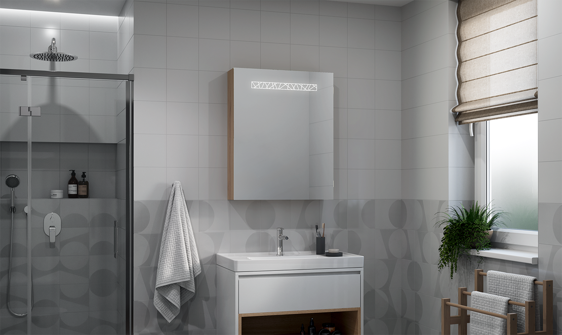 The Emera cabinet combines a simple form with a striking accent in the form of a geometric LED decoration placed at the top of the front. This gives it a modern, slightly designer feel that perfectly complements both minimalist and more decorative bathroom interiors.