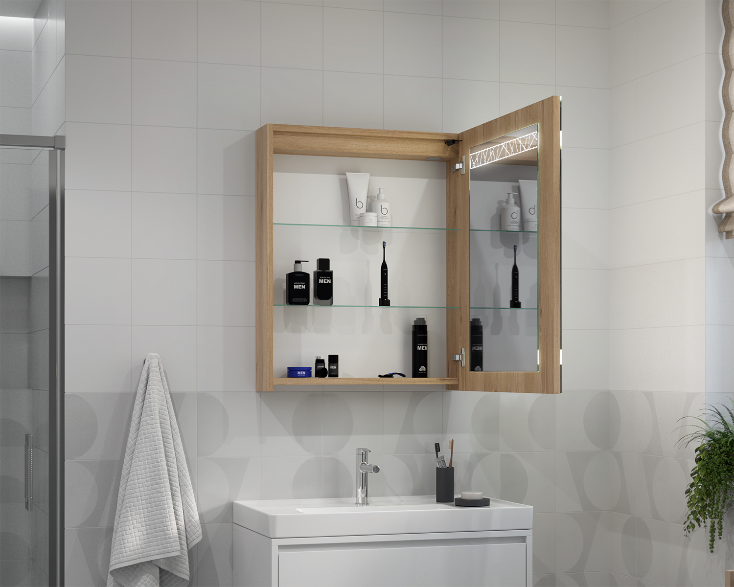 Inside, the cabinet features practical shelves that allow for convenient organization of everyday cosmetics. Subtle lighting makes the mirror easy to use while creating a cohesive, elegant composition with other design elements.
